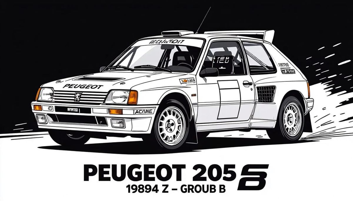 A high-contrast black and white poster of a Peugeot 205 Turbo 16 rally car. Features bold lines, pure ink on white, and stylized text. Captures rally car details.
