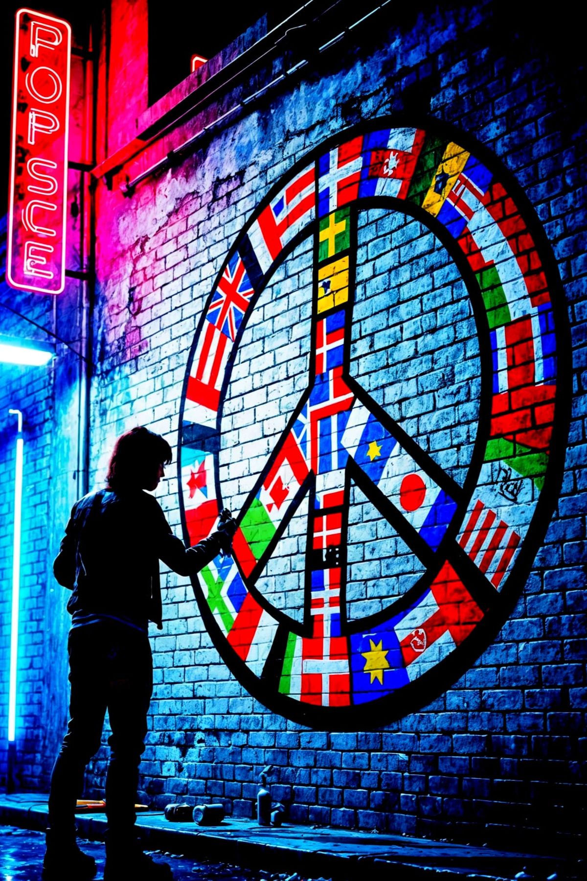 This image shows a young punk artist spray-painting a detailed world flag peace sign mural on a brick wall. Neon lights cast long shadows in a gritty, cinematic urban scene.