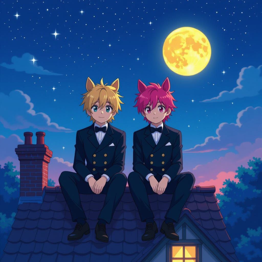 This image shows two young men with horse ears sitting on a rooftop under a starry sky. They are dressed as chimney sweeps in an anime style with manga-inspired textures and cinematic lighting.