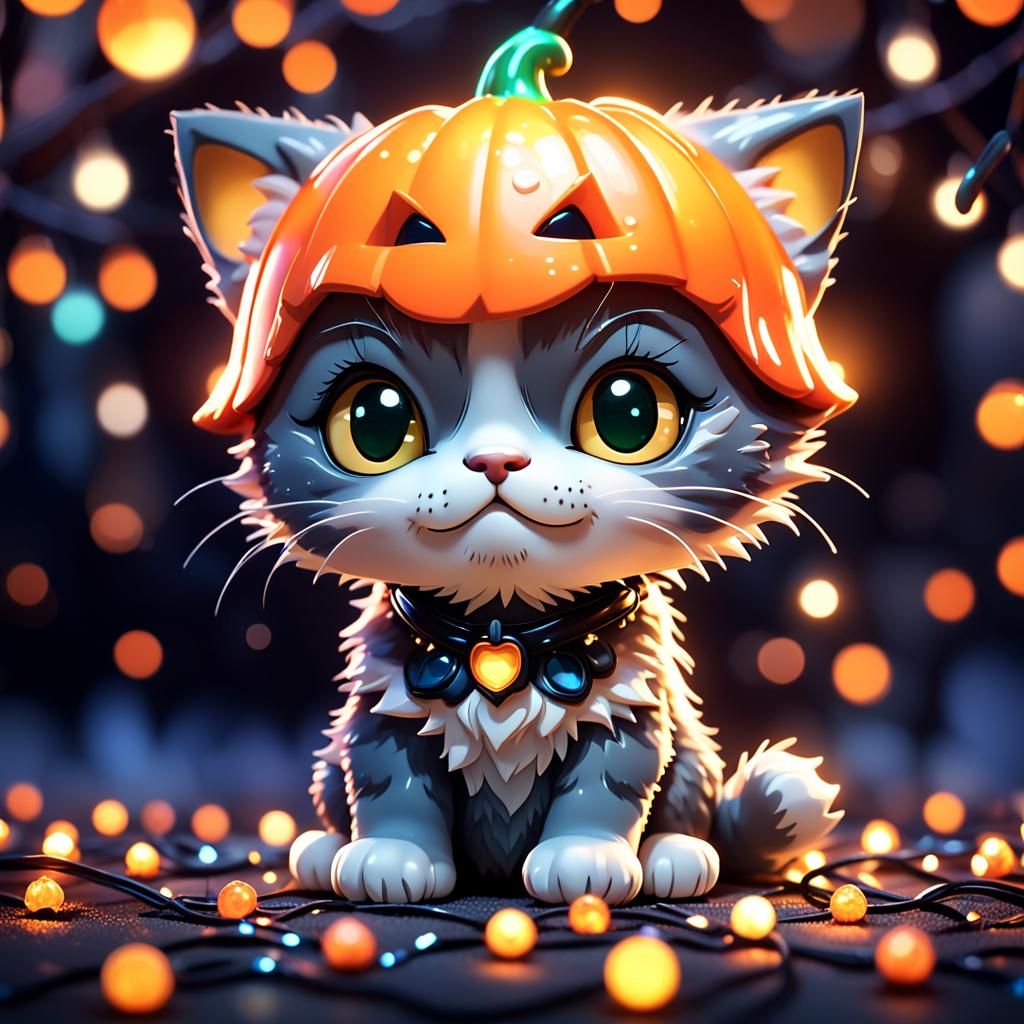 This image shows an adorable chibi-style kitten surrounded by glistening Halloween lights. Rendered as highly detailed 3D digital art with a shallow depth of field and vibrant color palette.