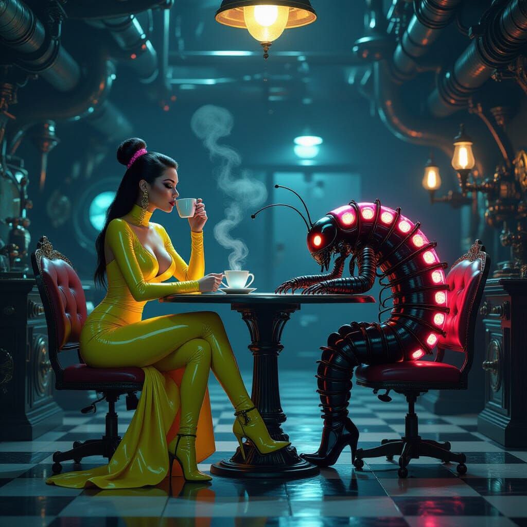 A woman in a bright latex dress and glowing shoes sips coffee with a sentient centipede in a vast, dimly lit steampunk engine room. Digital concept art with dramatic lighting.