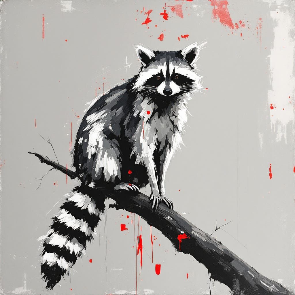 This image features a raccoon on a branch, rendered with bold, expressive brushstrokes. The artwork utilizes vibrant colors and intricate textures for a dynamic composition.