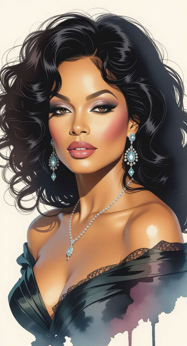 A portrait of Diana Ross wearing jewelry. The artwork blends ink drawing with watercolor techniques, creating a mesmerizing visual experience in an ethereal style.