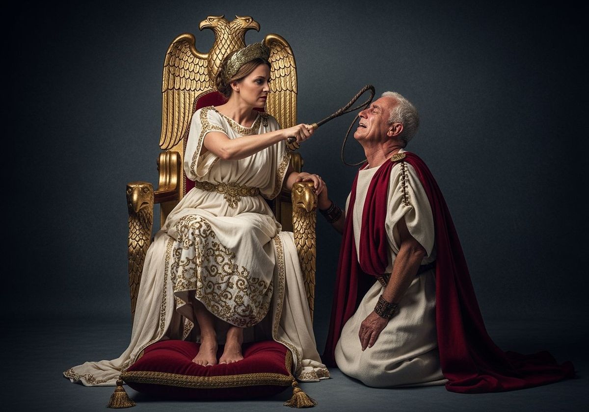 This image shows a Roman Empress on her golden throne as she whips a kneeling senator. The scene is captured with professional photography techniques, using natural light and a shallow depth of field.