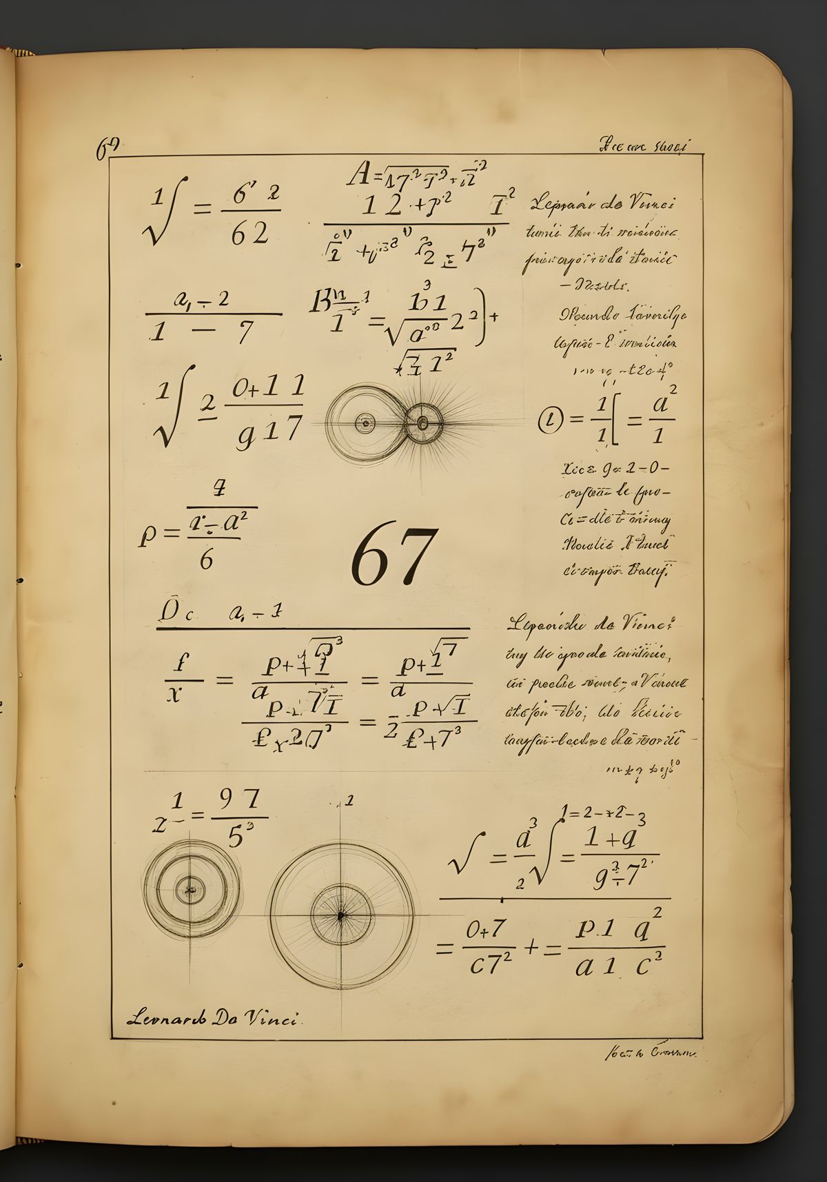 This image emulates a page from Leonardo DaVinci's notebooks, featuring intricate math equations, sketches, and numbers on aged yellow paper with pencil etchings.