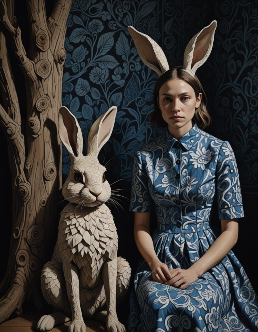 AI lithography showcases a girl in a blue dress inside a trunk, with a boy in a rabbit mask nearby. Moody, desaturated colors and expressive brushstrokes create a unique narrative.