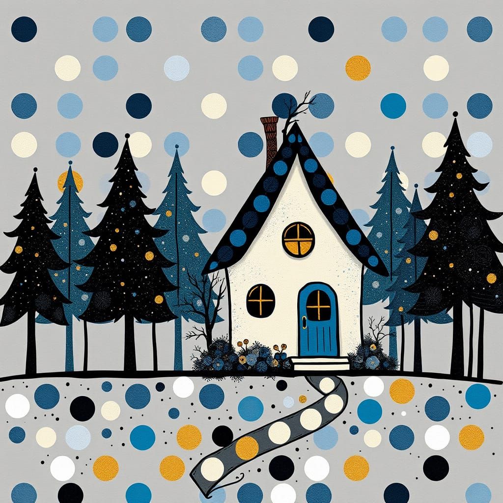Small fairy tale cottage in woods, surrounded by trees, set against gray background with bold, modern, pizzazz polka dots, in vibrant shades of blues, creams, grays, black, white, and gold, in style of Mondrian, with geometric shapes and lines, reminiscent of Piet Mondrian, Charley Harper, and Bridget Riley, with multi-media textures.