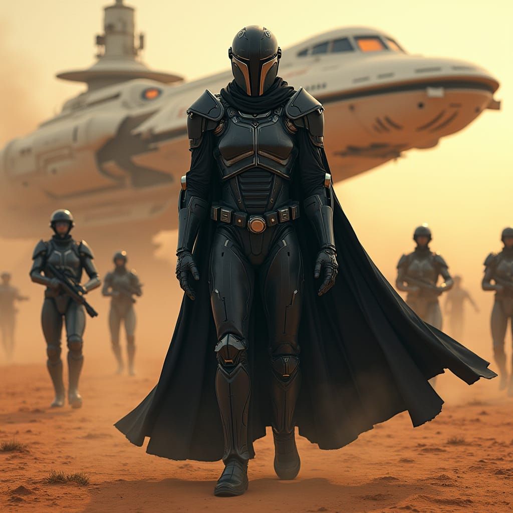 This image shows a human in a futuristic armored suit standing on a starship's landing ramp, surrounded by men in gray suits, on a desert planet at dawn. The scene blends industrial and mystical elements, reminiscent of sci-fi art styles.