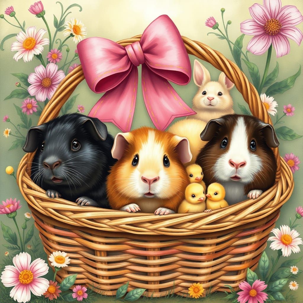 This charming image depicts three guinea pigs peeking out of a wicker gift basket filled with baby bunnies and chicks, surrounded by lush greenery and colorful flowers, all tied together with a vibrant pink bow in a whimsical, storybook style