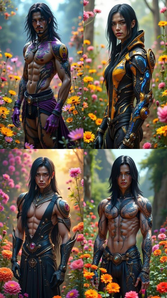 A striking digital artwork of a handsome Japanese cyborg man with a sculpted physique, standing amidst a vibrant flower garden, rendered in a detailed dark fantasy style.