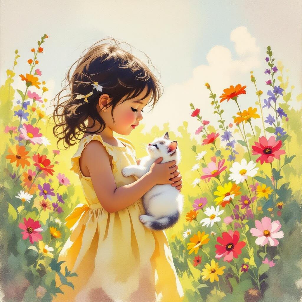 This watercolor painting depicts a young Hispanic girl in a yellow dress holding a white kitten amidst a colorful summer garden. The style features soft colors and visible brushstrokes.