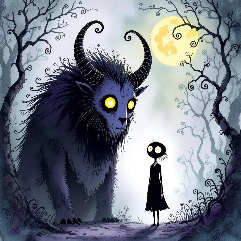 Create your own eerie scenes with our free AI image generator in the style of Tim Burton.