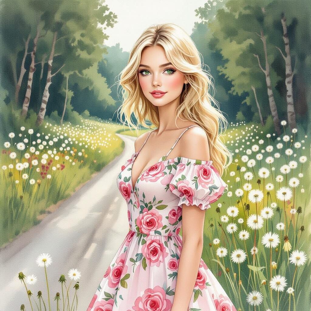 This image shows a woman standing on a forest road in a whimsical watercolor art style. She wears a rose dress and is surrounded by dandelions, rendered with soft brushstrokes.