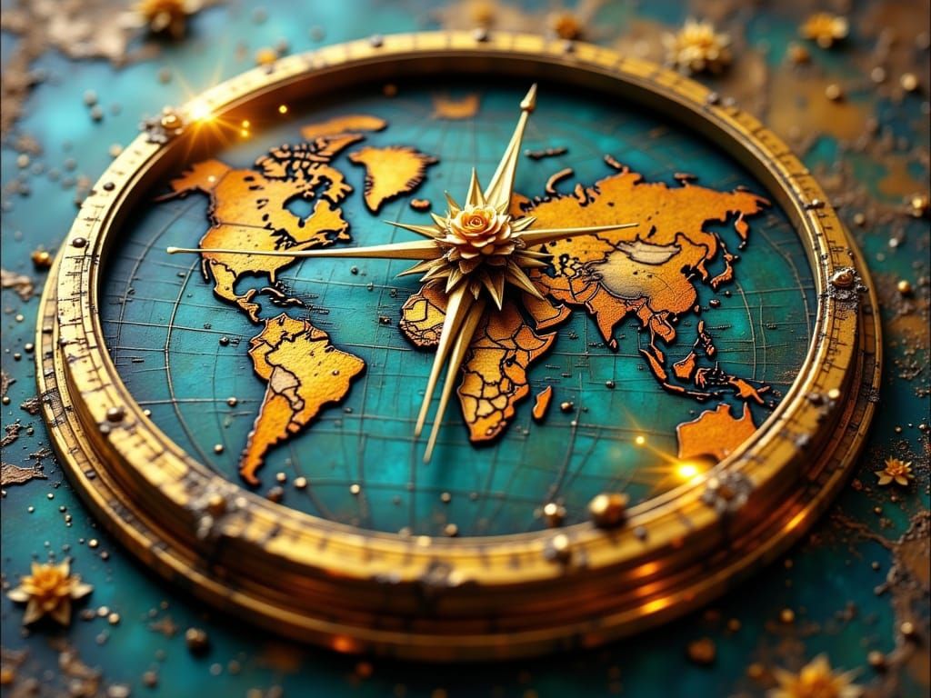 This image shows an antique world map featuring a golden compass. The map has intricate 3D relief, teal and turquoise blues, warm orange and gold highlights, and a vintage feel.