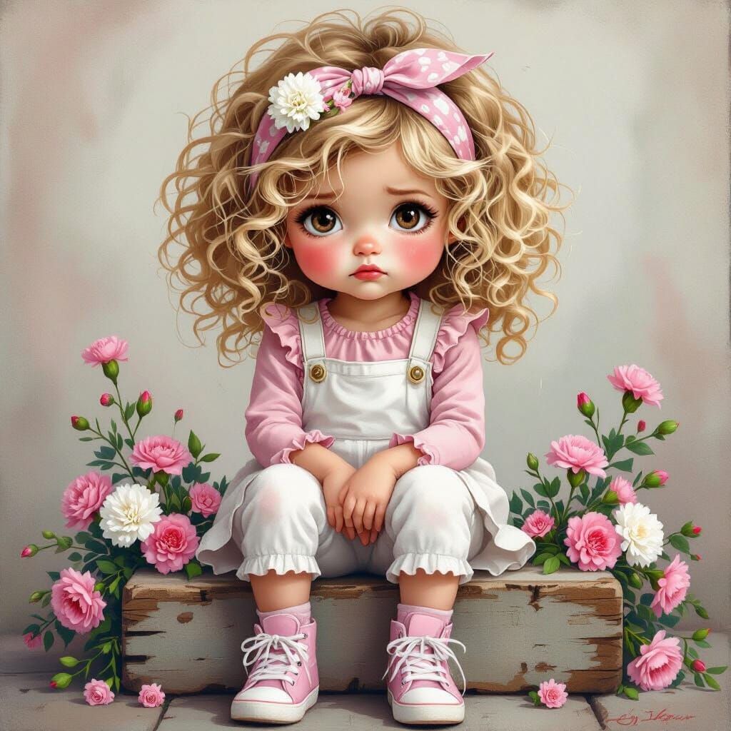 This image shows a young girl with curly blonde hair and a floral headband, sitting on a weathered wooden block surrounded by pink and white carnations. The image has an airbrushed, soft watercolor painting aesthetic.