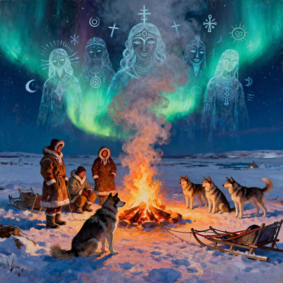 This oil painting captures a mystical Inuit night scene with people and sled dogs by a campfire. Ethereal spirit figures and symbolic aurora blend with smoke, creating a dreamlike atmosphere.