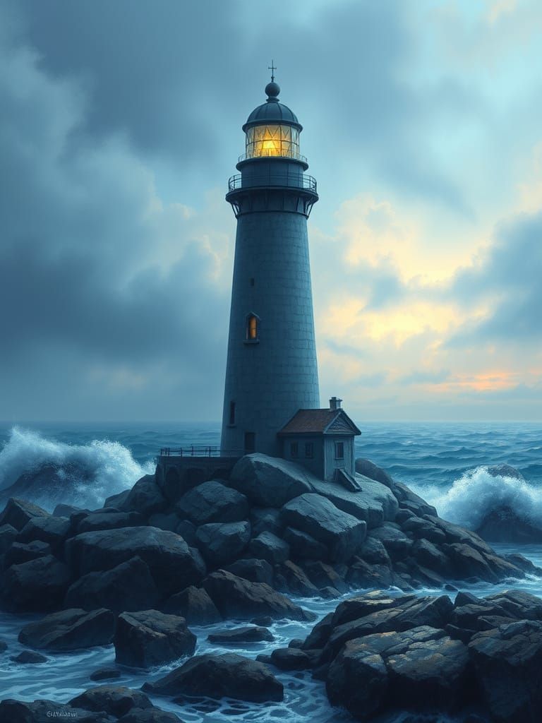 This hyperdetailed fantasy image depicts a dark blue lighthouse on a rocky coast, surrounded by a stormy sea, all rendered in varying shades of blue with an ethereal mist.