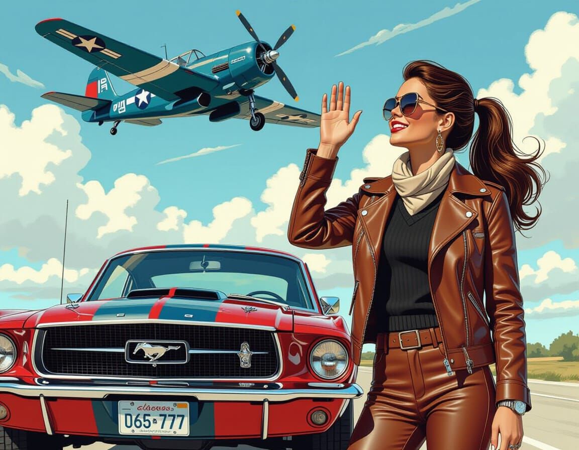 A vibrant comic art image of a brunette pilot in 1970s style. The pilot stands near a classic car, gazing at a vintage fighter plane in the sky, rendered in a color comic art style.