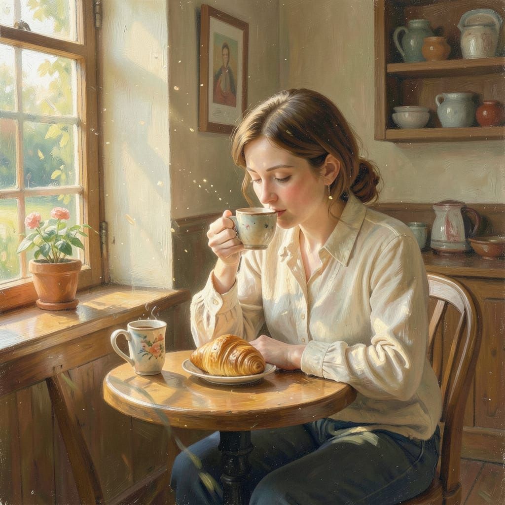 This image shows a peaceful cafe interior bathed in warm sunlight, with a woman quietly savoring coffee and a danish. Rendered in a soft, impressionistic oil painting style.