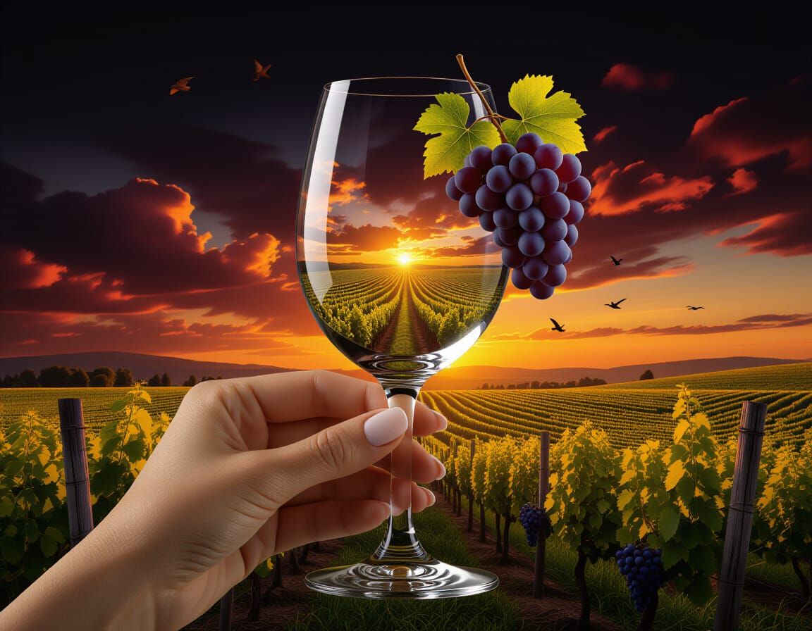 A surreal cinematic masterpiece featuring a delicate hand holding a crystal glass. Inside, a golden vineyard leads to a vibrant sunset, with ripe grapes on the rim. Photorealistic concept art.