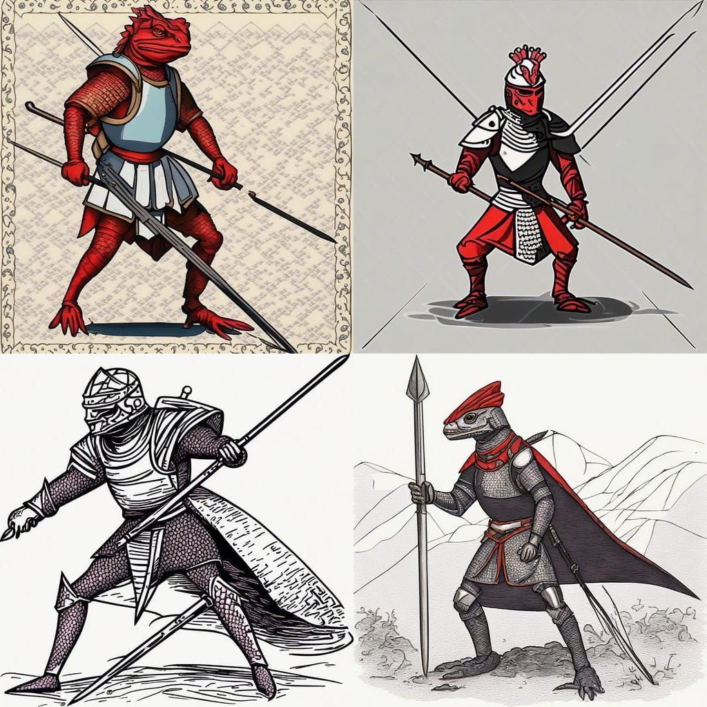 This image depicts a scaly warrior from a fantasy realm, clad in ornate armor and wielding a spear, showcasing a mix of reptilian and regal aesthetics.