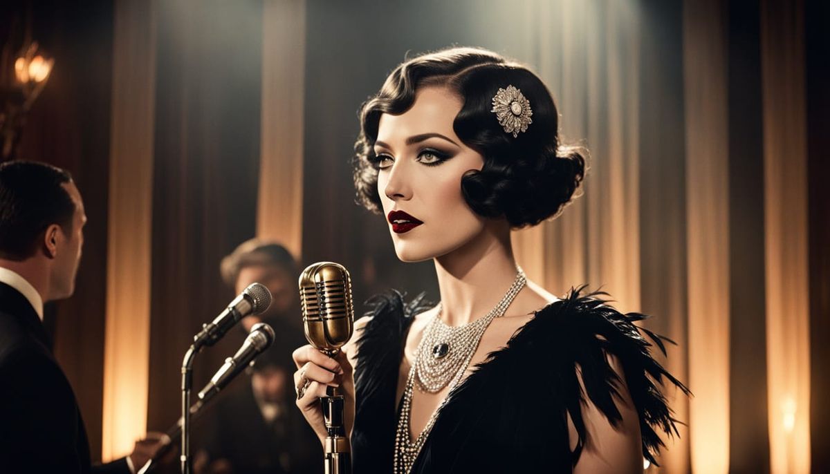 Beautiful, extremely luxurious, captivating, seductive with beautiful, accentuated body curves, young woman wears a beautiful black feathered dress with long elbow length gloves while on stage singing into a microphone, her mouth open. Behind her, several ...