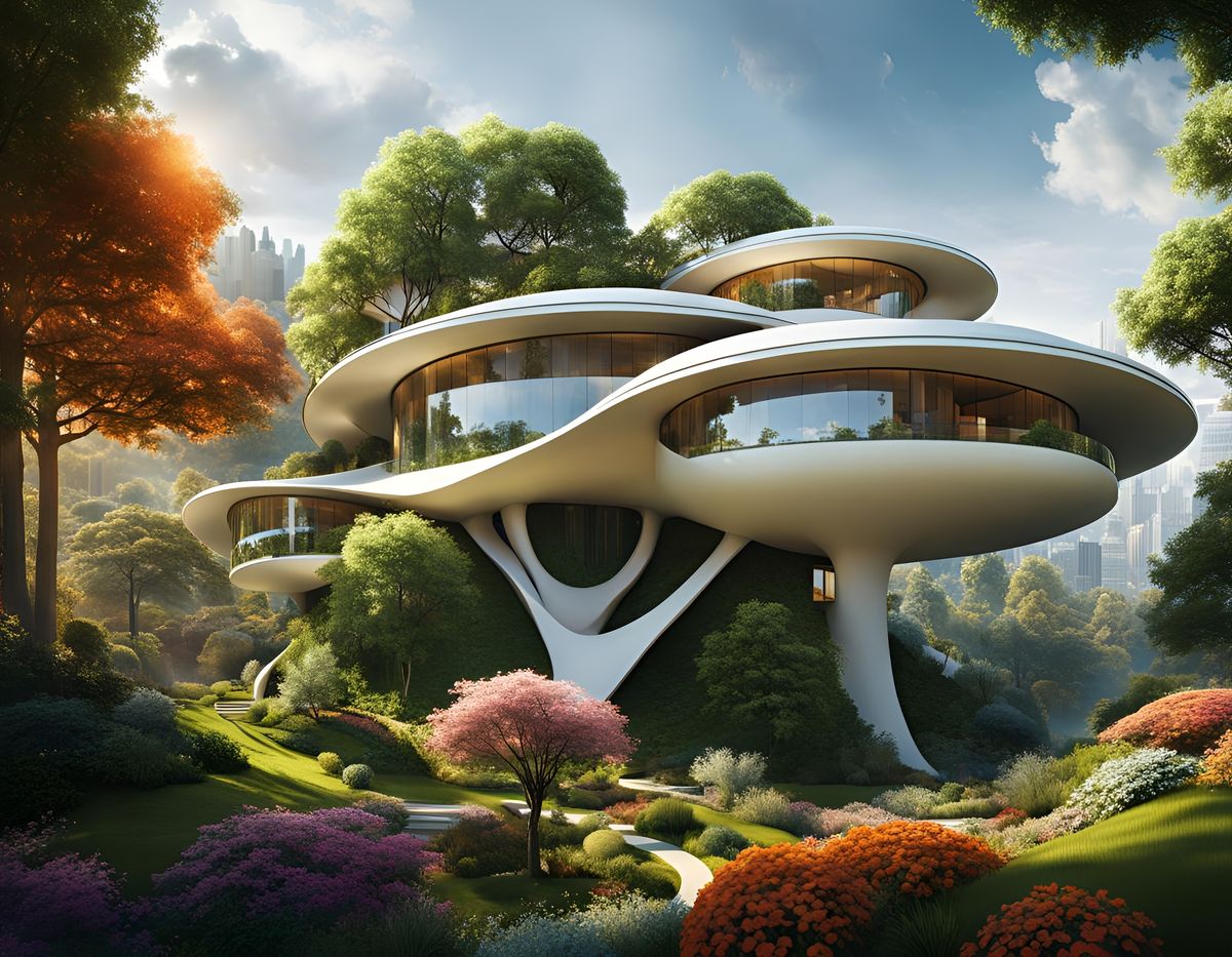 A futuristic home blends seamlessly with nature. The outlandish architecture features domes and curves, creating a hyper-realistic and elegant scene. The digital painting is intricate and detailed.