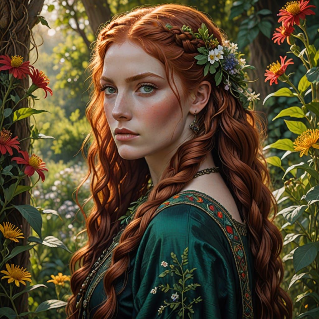 This image shows a photorealistic portrait of a young woman with vibrant red hair, emerald eyes, and braided hairstyles adorned with wildflowers. Captured in a style focused on rich colors and intricate detail, reminiscent of Pre-Raphaelite art.