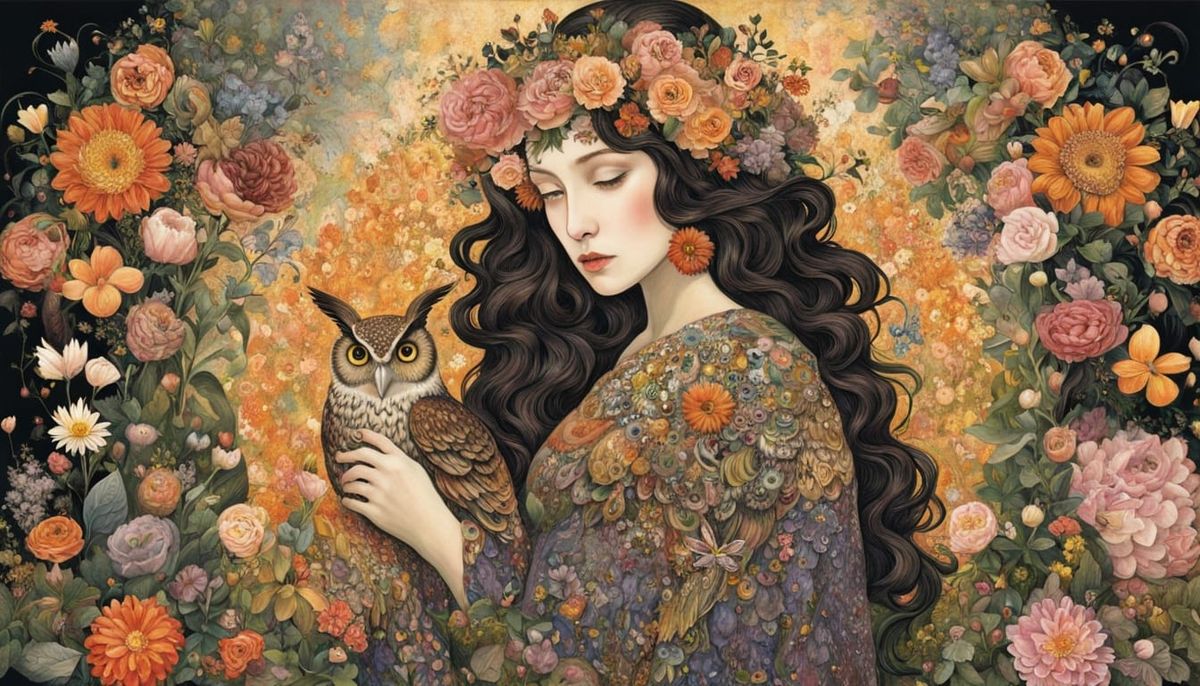 This image shows a vibrant, floral goddess representing the light half of the year, inspired by the styles of Gustave Klimt and other notable artists, with a focus on intricate patterns and organic forms.