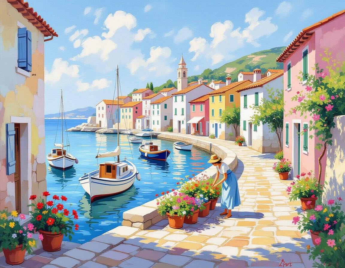 A picturesque view of a sunlit coastal town featuring cobblestone streets and pastel buildings. Fishing boats rest in the harbor under a clear sky. The art evokes tranquility in an impressionistic style.