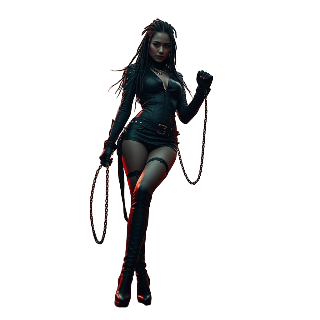 This image captures a mysterious, dominatrix figure standing amidst a crumbling cemetery, surrounded by a dark, gothic atmosphere, bathed in a fiery, blood-red glow, with intense, crimson hues illuminating her imposing presence.
