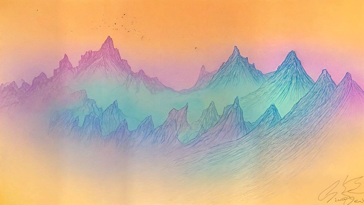 This image showcases a hyperdetailed ink drawing of mountains. It features intricate cross-hatching and line work, creating a dramatic and etched effect.