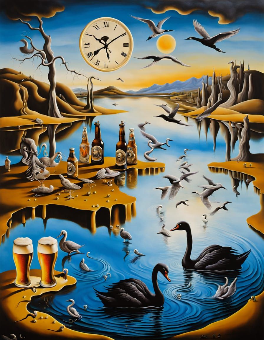 A surreal image of melting clocks and beer bottles by a lake, with fish, birds, and black swans. The artwork evokes Salvador Dali's style, rendered as matte oil on canvas.