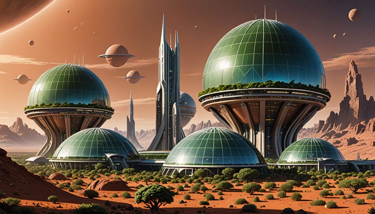 This image shows a futuristic cityscape on Mars and Vulcan, featuring a mix of odd-sized buildings, sleek skyscrapers, and dome-shaped structures, blending steel and concrete in a vibrant, otherworldly environment.