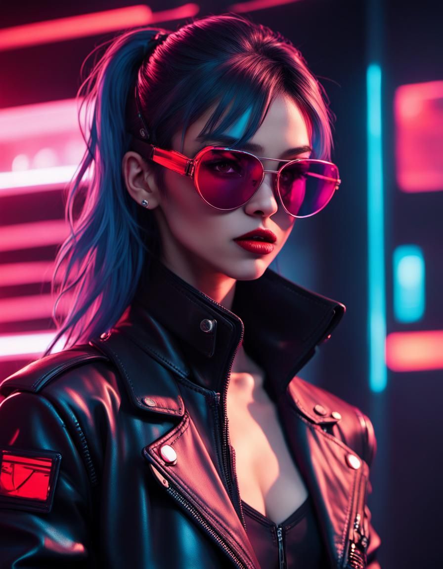 A close-up image shows a cyberpunk anime assassin in sunglasses and a leather jacket. The image evokes an 80s retro vibe with neon red and black light accents, rendered in a lofi OVA style.