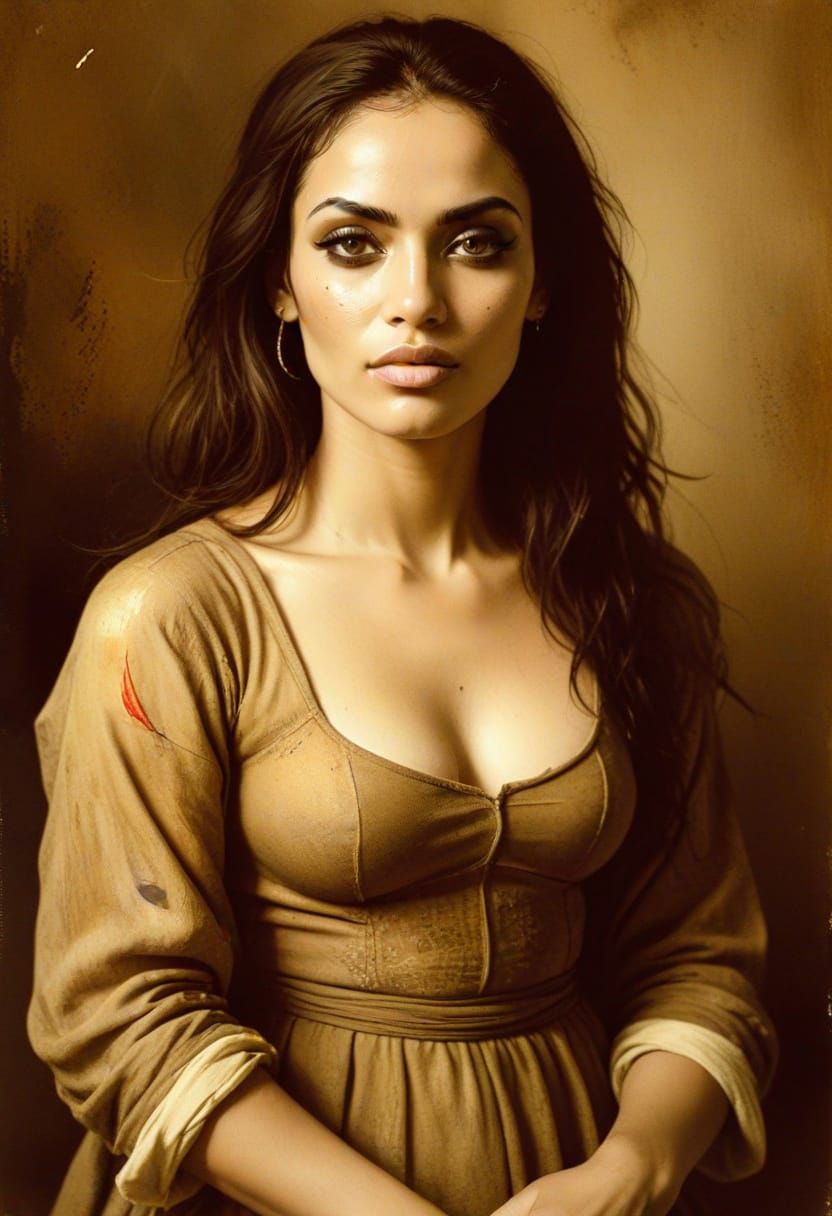 This watercolor portrait captures a confident North African supermodel with smokey eyes and toned skin in a rustic, emotional boudoir style. The detailed artwork emphasizes raw emotion.