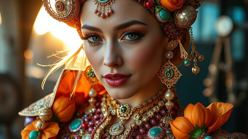 This image showcases a hyper-realistic portrait of a beautiful woman in elaborate, colorful, futuristic attire. Soft, bright lighting enhances the intricate details and vibrant colors, creating a stunning, high-resolution visual.
