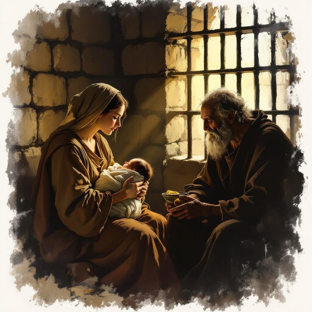 This image depicts a mother feeding her elderly father in a stone prison cell, illuminated by dramatic lighting. Rendered in a Renaissance realism style with chiaroscuro, it evokes deep compassion and sacrifice.