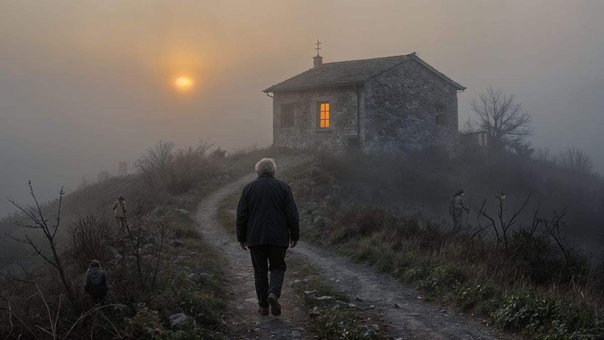 This atmospheric oil painting depicts an elder man on a winding, foggy path. A lone illuminated window offers a beacon of hope in the twilight, rendered with dramatic lighting and somber tones.