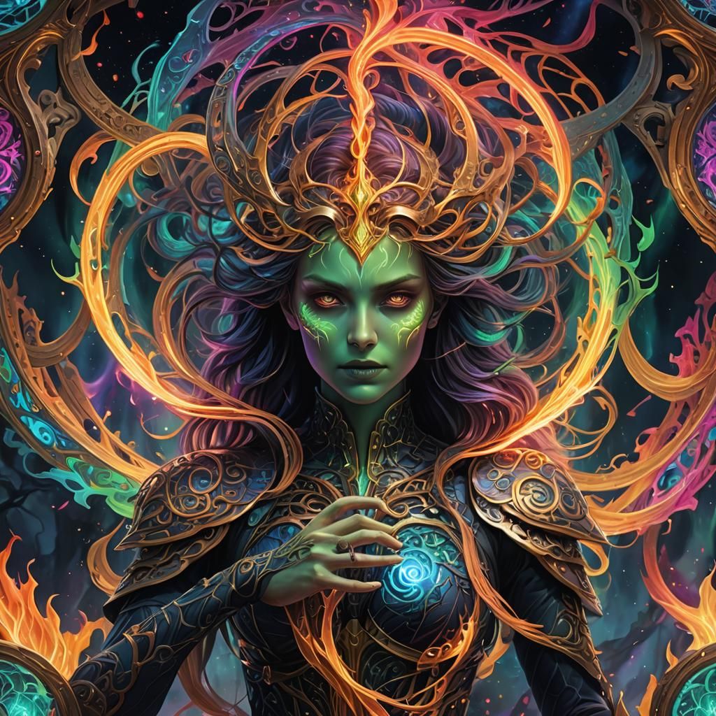 This image shows a feral, angry bugbear in a dynamic pose, holding a large battle hammer in a forest setting. The digital artwork features vibrant magic swirls and geometric fractal patterns.