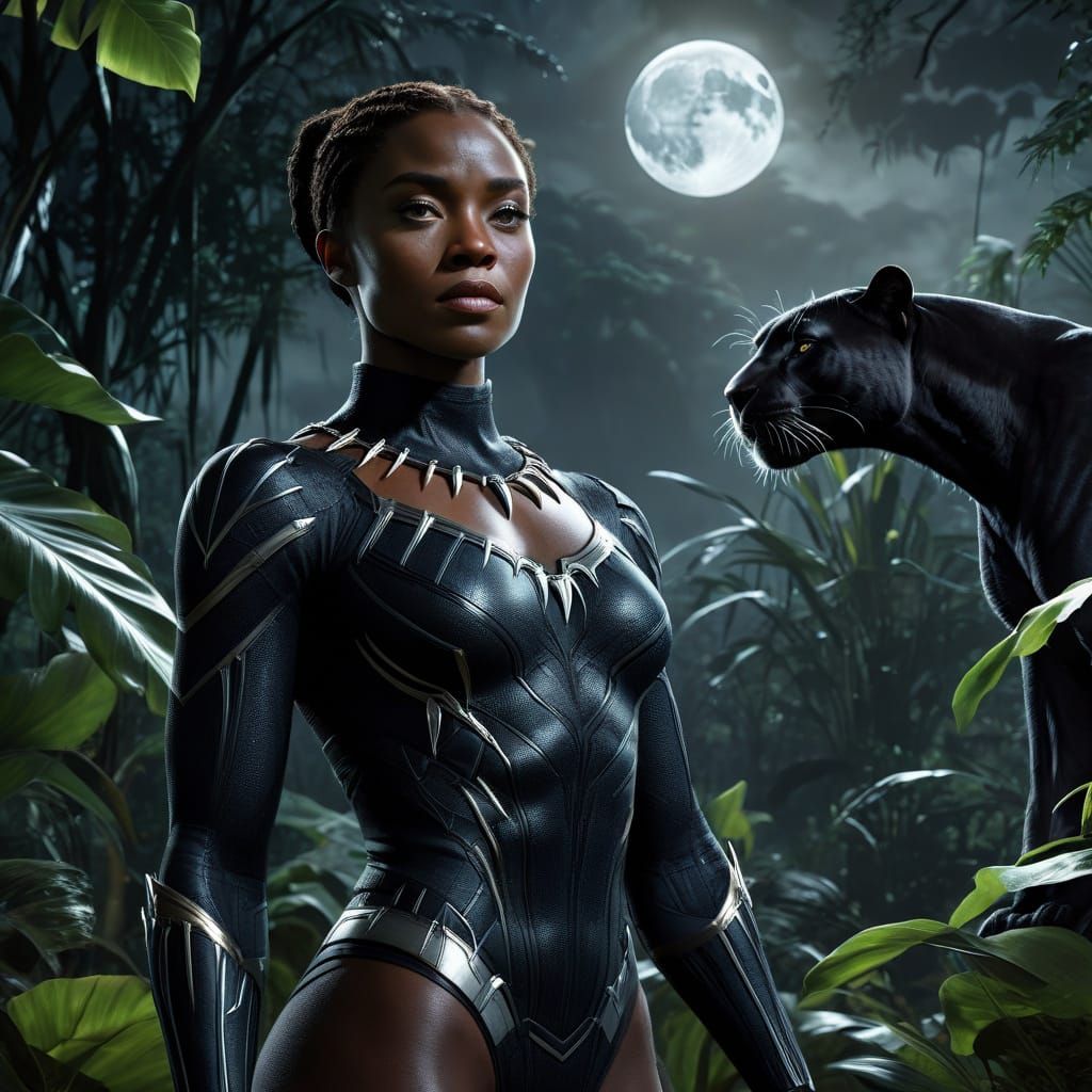Female Black Panther with a black panther 🤭 at night in a jungle background