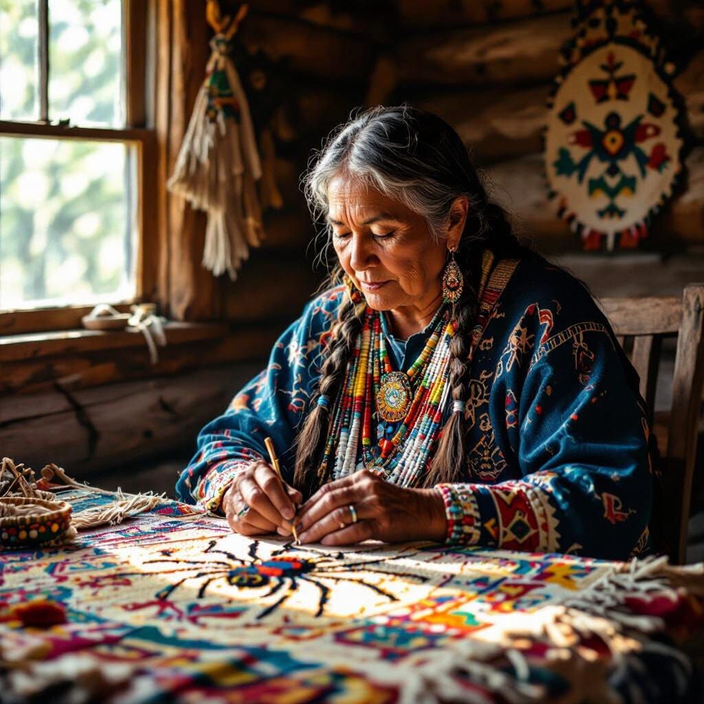 An Ojibwe elder shares a story about Spider Woman in a sunlit lodge. This art captures ancient wisdom with bold lines and vibrant earth tones, inspired by traditional Indigenous art styles.