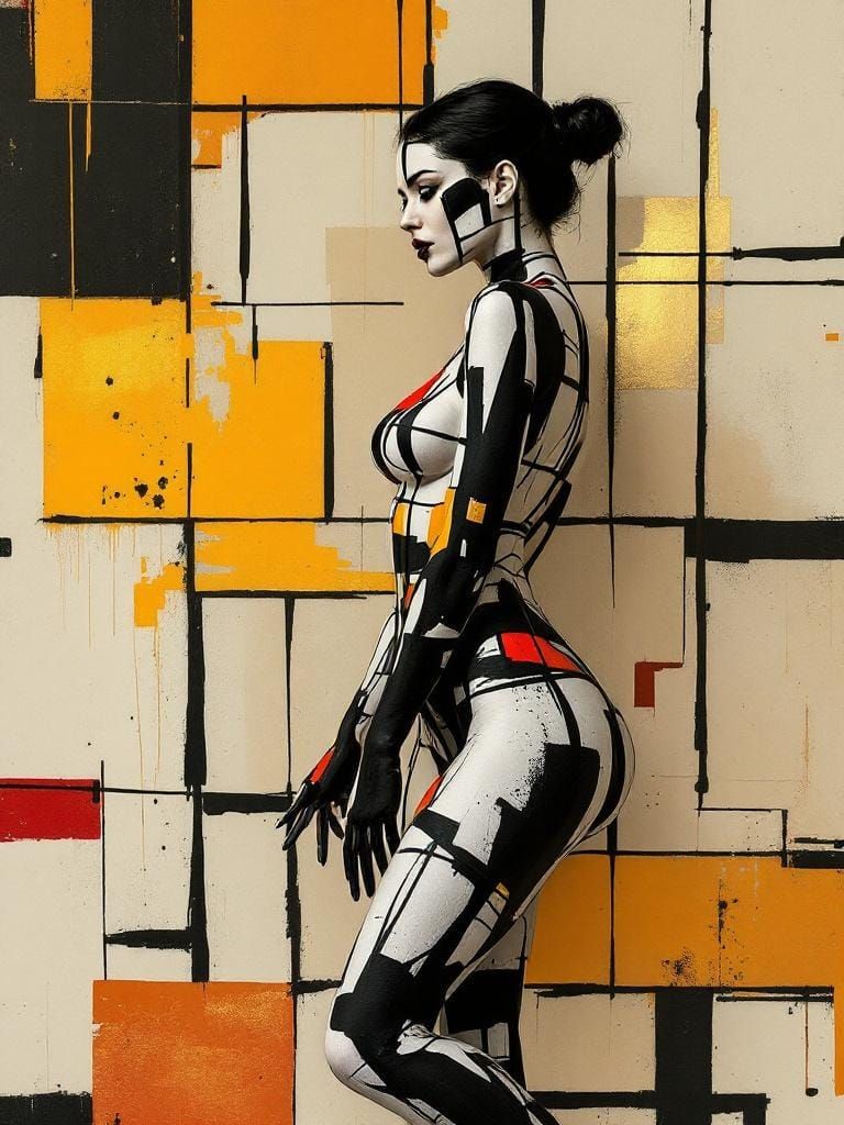 This image shows a woman in profile blending into a geometric wall design. The artwork combines bold strokes, distressed textures, and high-contrast shadows, creating a weathered urban scene with a film noir aesthetic.