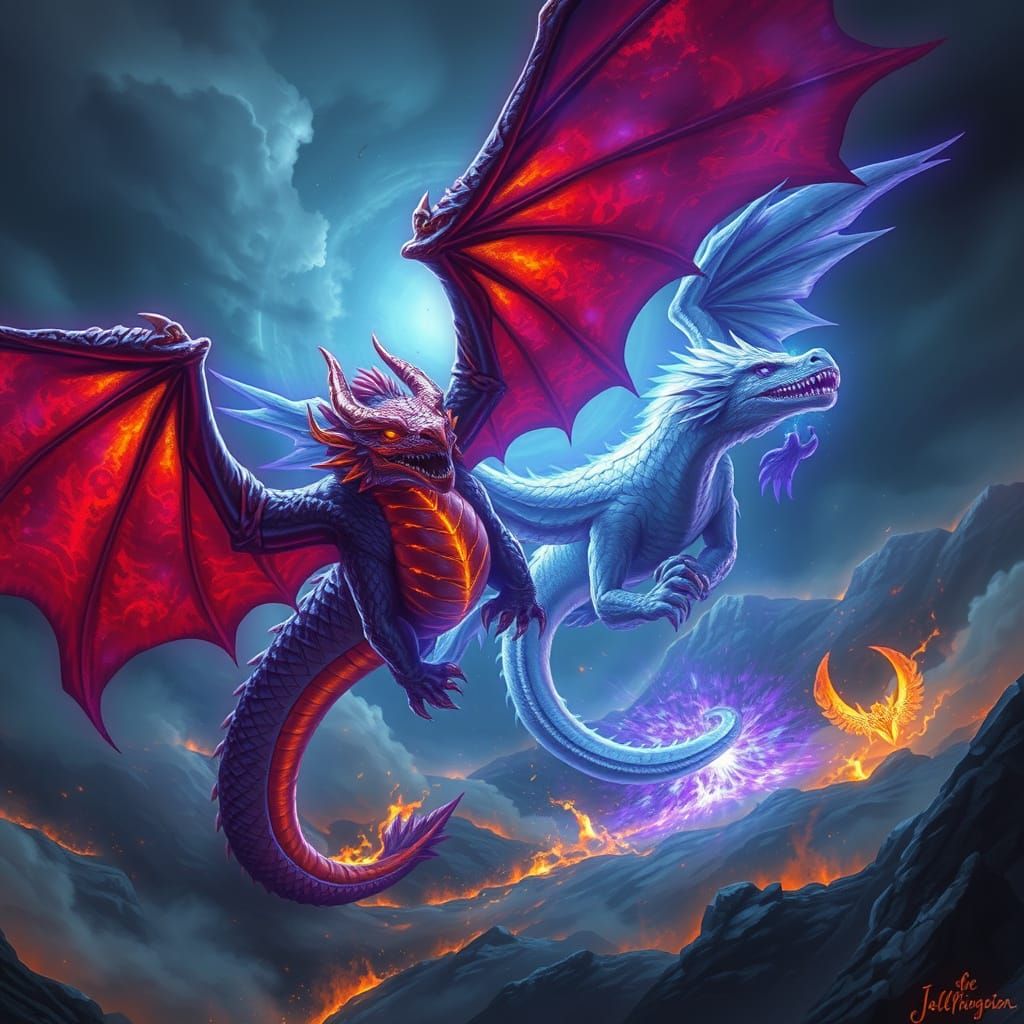 A dramatic image of two dragons soaring above a dark, chaotic landscape filled with magic and light. One dragon is crimson with glowing violet veins, the other silver with violet energy.