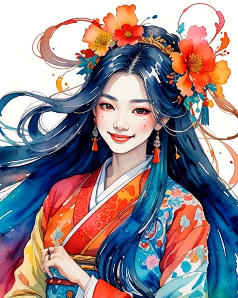 This image showcases a vibrant fantasy portrait with intricate lineart and detailed brushstrokes. The style blends watercolor, ink, and expressionist oil painting techniques for a surreal, colorful effect.