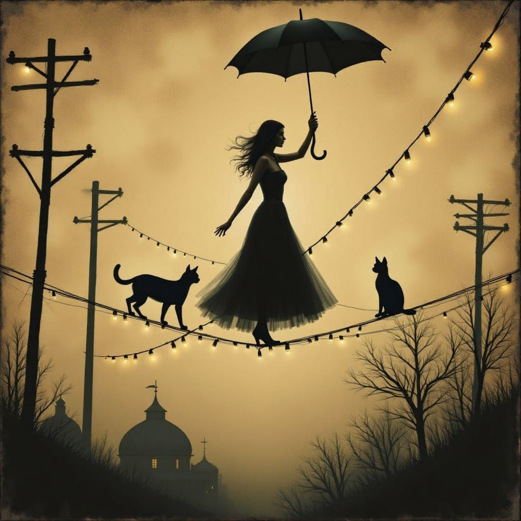 This image shows a solitary woman in a flowing dress, tightrope walking on glowing string lights above old European church domes. Features dramatic lighting and a moody atmosphere.