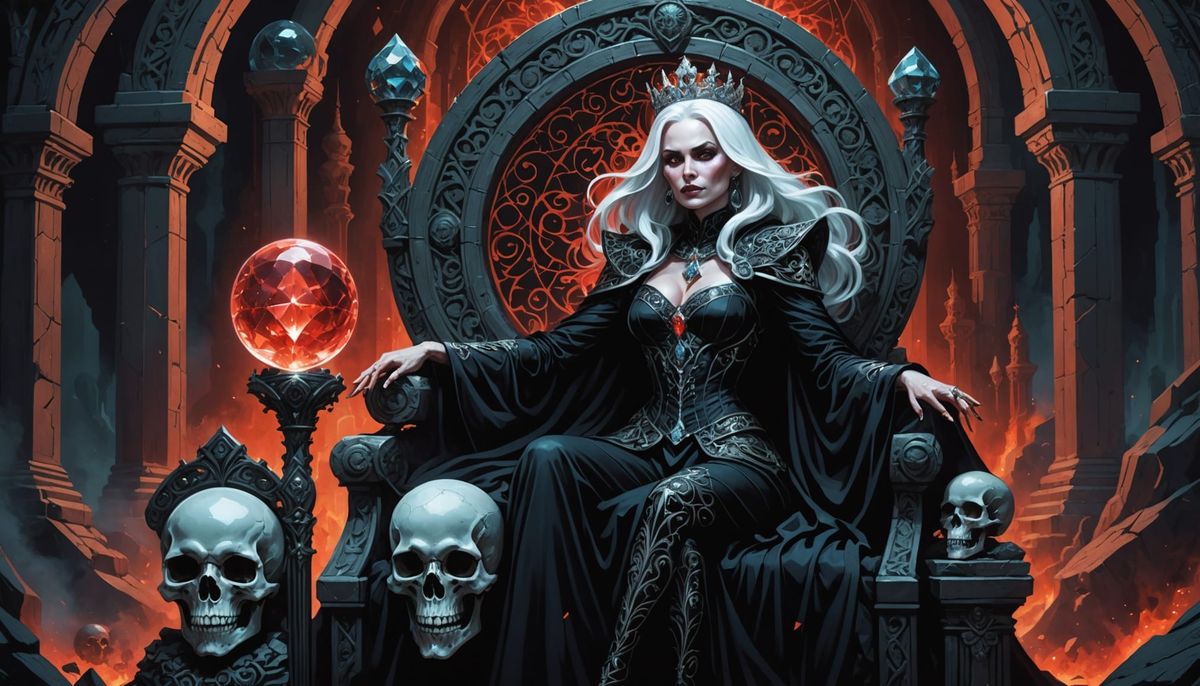 This image shows a celestial figure, Madame Mayhem, on a skull throne in a crystal cavern, surrounded by gothic characters in a shadowy cathedral-like hall, rendered as dark fantasy art.