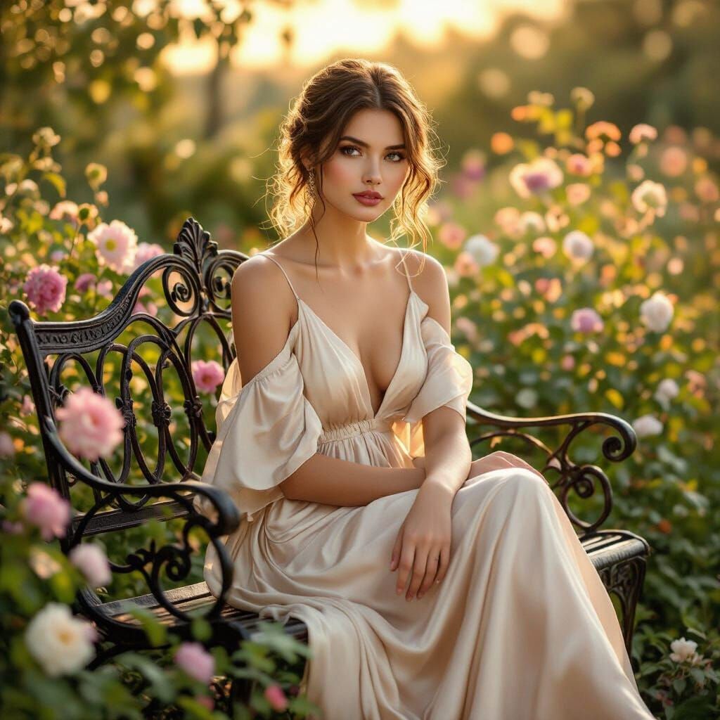 This image shows a woman in a silk dress on a wrought-iron bench, amidst flowers and greenery. The scene is bathed in golden sunset light, creating a serene and romantic atmosphere reminiscent of art nouveau painting.