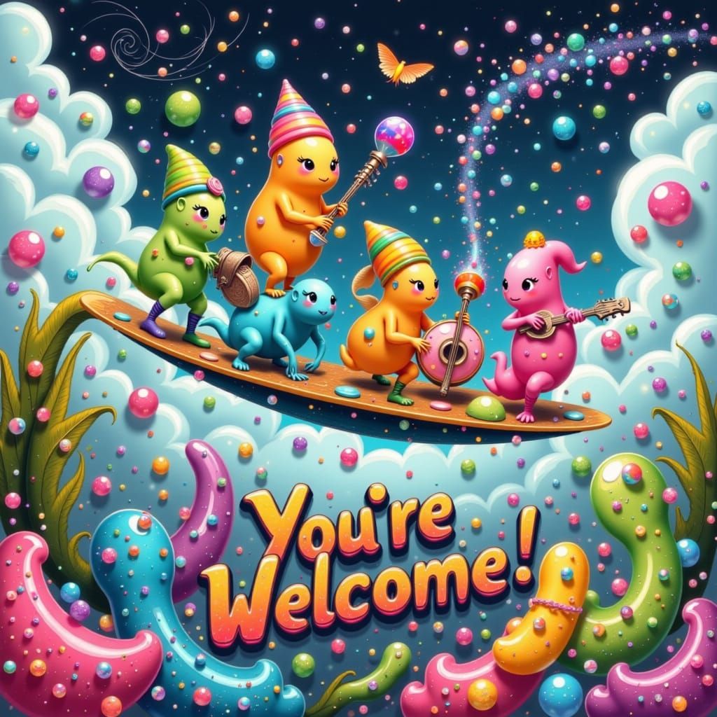 This image shows jellybean people playing instruments on a spoon. The scene features swirling patterns and bold lines, in a vibrant, psychedelic style with bright textures and radiant colors.