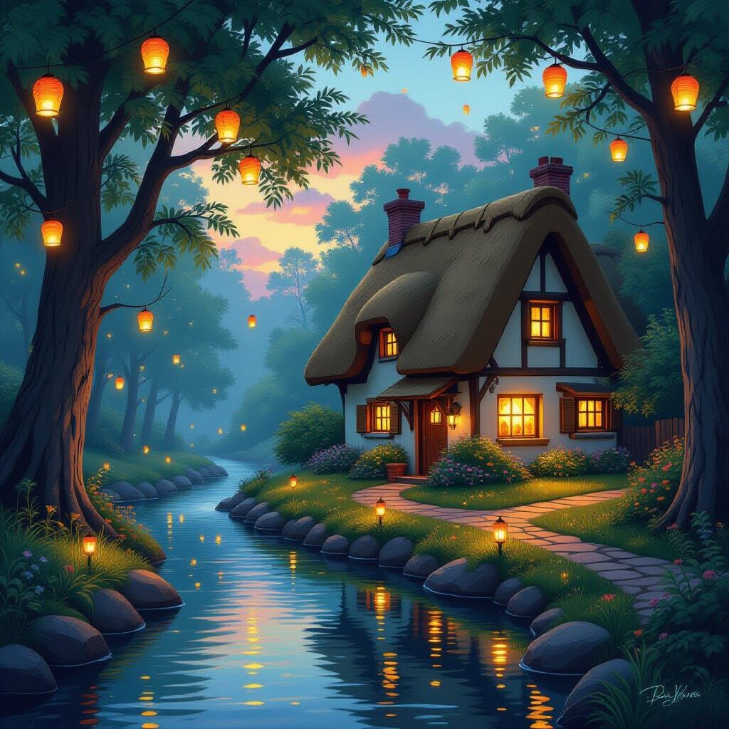 This image shows a charming cottage with a thatched roof next to a stream. Paper lanterns illuminate the scene, as fireflies create a magical atmosphere. A digital painting with a soft style, full of wonder.